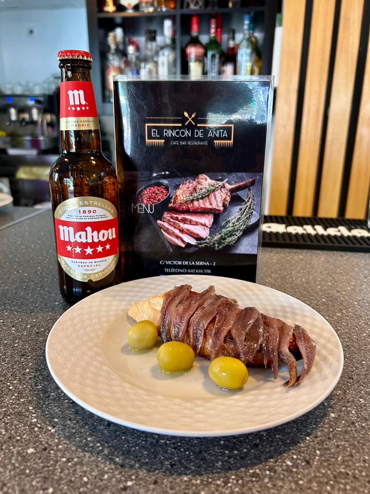 Pincho pan tostado con anchoas, tumaca y aceitunas con un TERCIO.