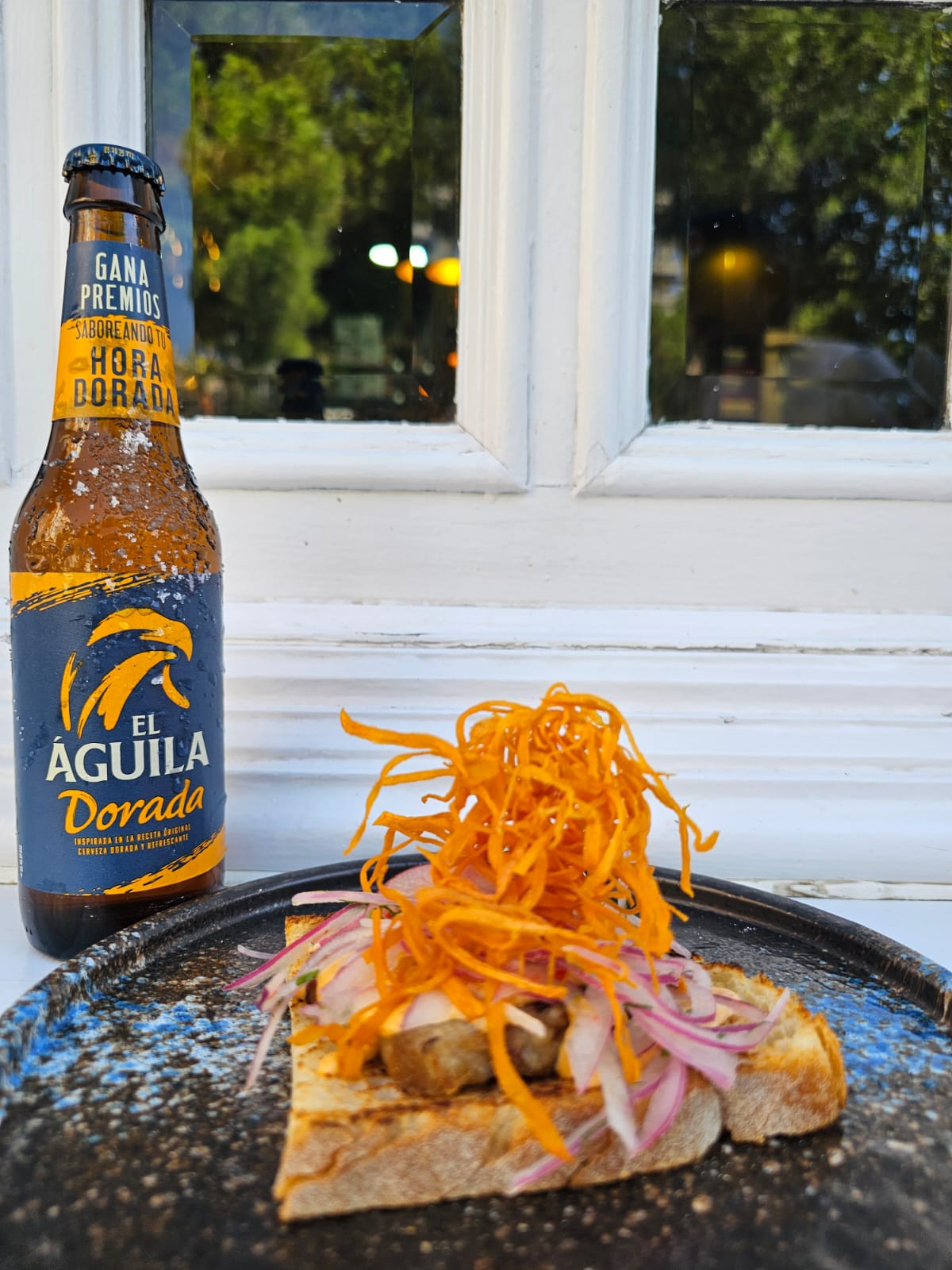 Tosta de Chicharrón Peruano acompañado de un TERCIO El Águila.
