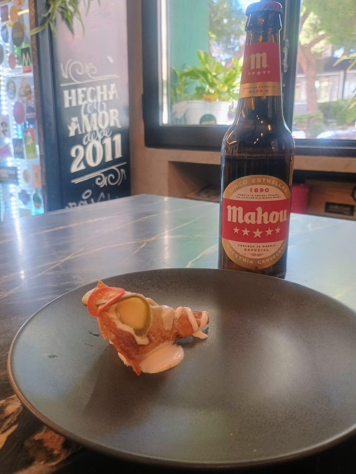 Wonton frito con encurtidos acompañado de un TERCIO de Mahou.
