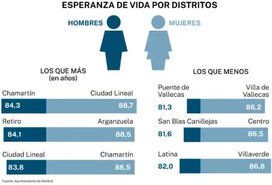 De este modo, encontramos barrios que son recurrentes en lo que respecta tanto una esperanza vida alta como a una más baja. Entre los primeros, se repiten distritos como Ciudad Lineal, Chamartín y Retiro. Entre los segundos, se encuentran Puente y Villa de Vallecas, Latina, Usera y Villaverde, entre otros.