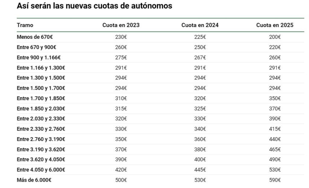 Las cuotas más bajas a pagar son de 230 euros al mes en 2023, 225 euros en 2024 y 200 euros en 2025. Las más altas serán de 500 euros en 2023, 530 euros en 2024 y 590 euros en 2025.