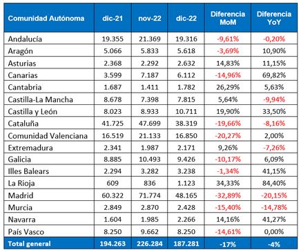 Diciembre cerró con un descenso de 8.347 afiliados con respecto al mes anterior y un total de 20.310.799 personas empleadas, lo que se traduce en un crecimiento interanual del 2,4% y un incremento de 471.697 afiliados con respecto al último mes de 2021. El paro descendió en 43.727 personas hasta alcanzar los 2.837.653 desempleados (un 1,5% menos que el mes pasado y un 8,6% menos que en diciembre de 2021).