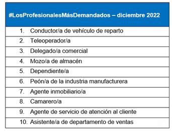 En el mes de diciembre, las tres primeras posiciones del ranking de los puestos más demandados las ocupan conductor/a de vehículo de reparto, con 32.843 puestos de trabajo ofertados; teleoperador/a, con 18.590, y delegado/a comercial (8.771).