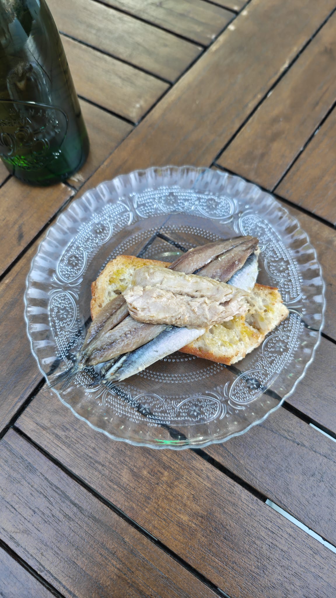 Tapa de anchoa doble, boquerón doble y ventresca. Servido sobre un pan tostado y chorrito de AOVE.